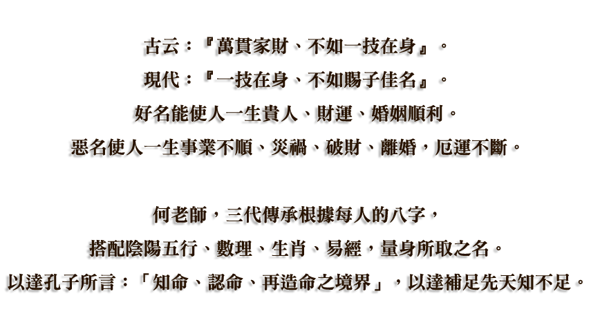 位於桃園中壢的易書生命理學院,是由57年次的何知易老師開辦服務,之所以會踏入這各行業,何知易老師表示是由於家學淵源,而且已經祖傳三代。出生於書香門第的何老師,從其服務辦公室的氛圍與裝飾,就可以感受到濃濃書卷氣。何老師表示古人有云:「萬貫家財、不如一技在身」、「一技在身、不如賜子佳名」,在他身上來說,家學的命理學術傳承使他有一技在身,而他的功力又幫助許多人得到了合適的名字,使他從事命理行業的熱情從未減退。